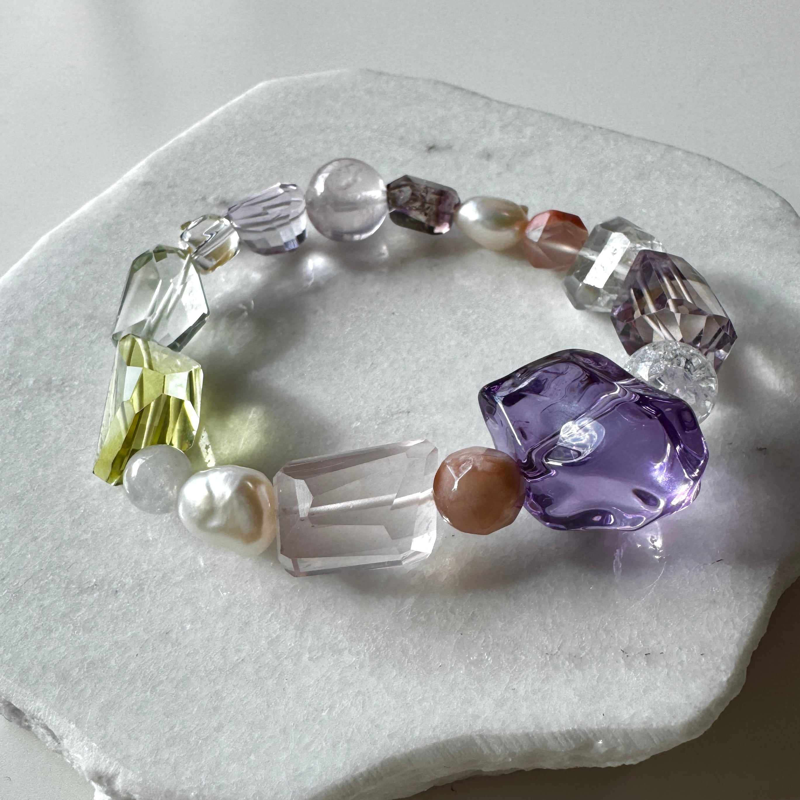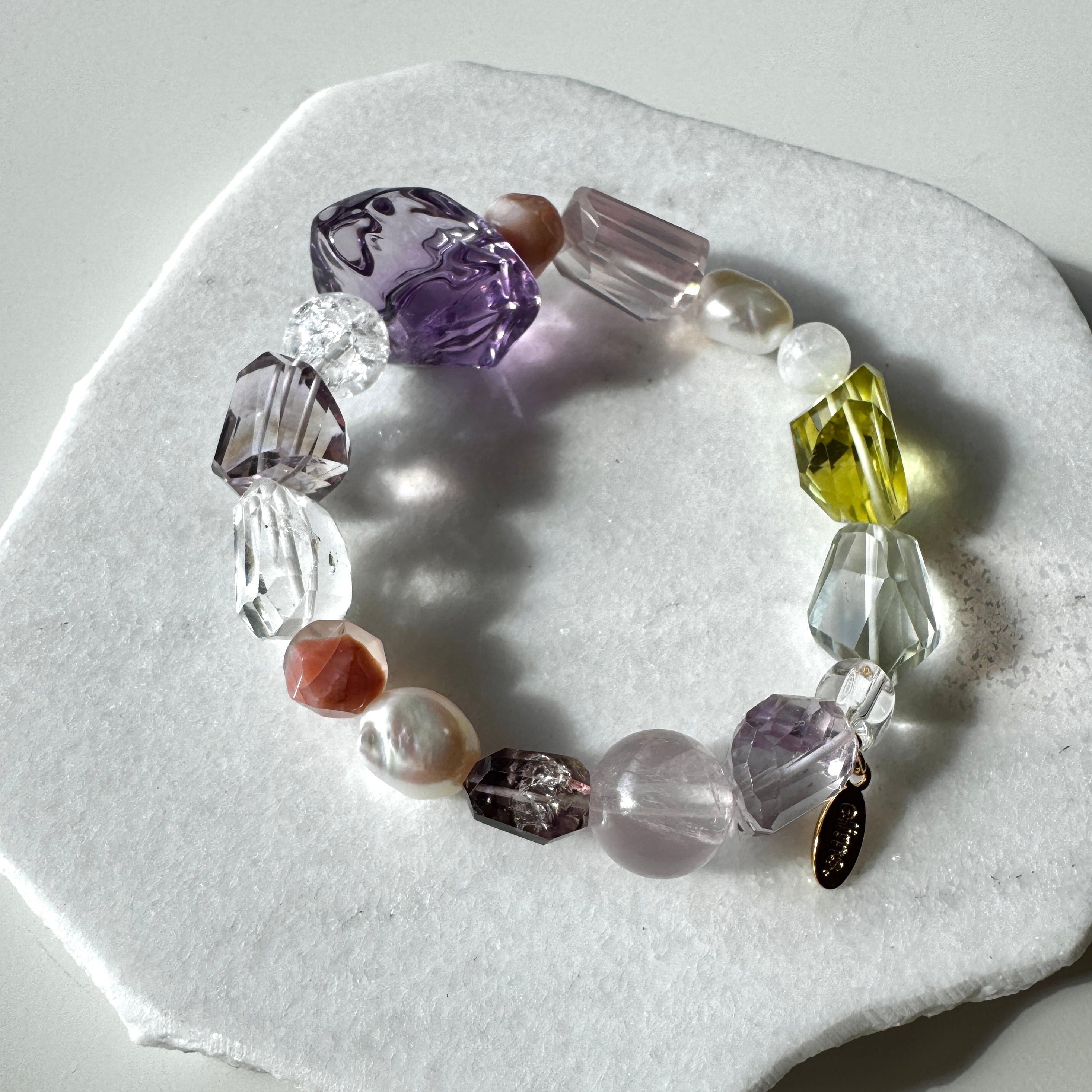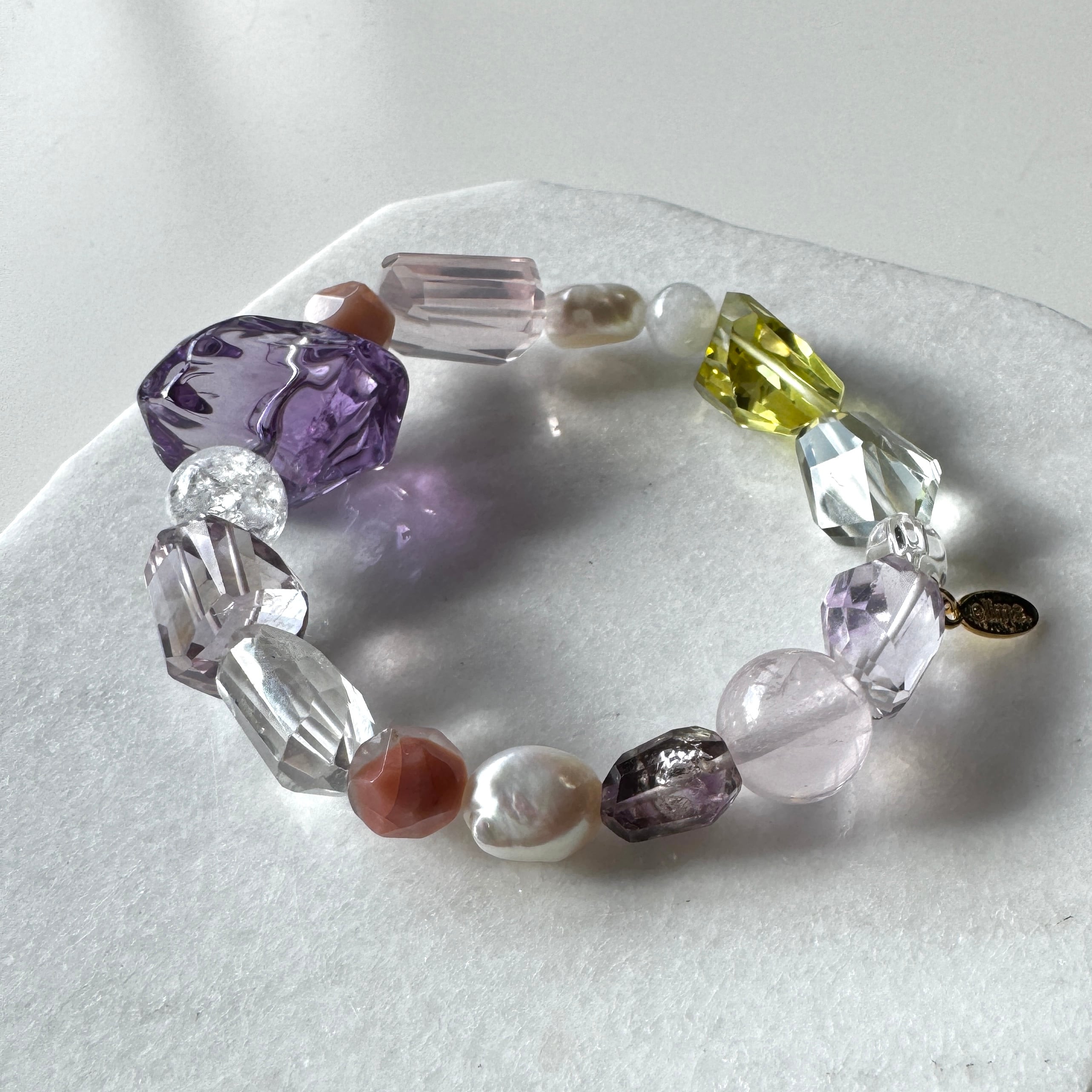 仕上げてくださった特別なアメジストを中心に、ピンク・グリーン・レモンの柔らかな光を重ねたオーロラの輝きのような一点物ブレスレット。