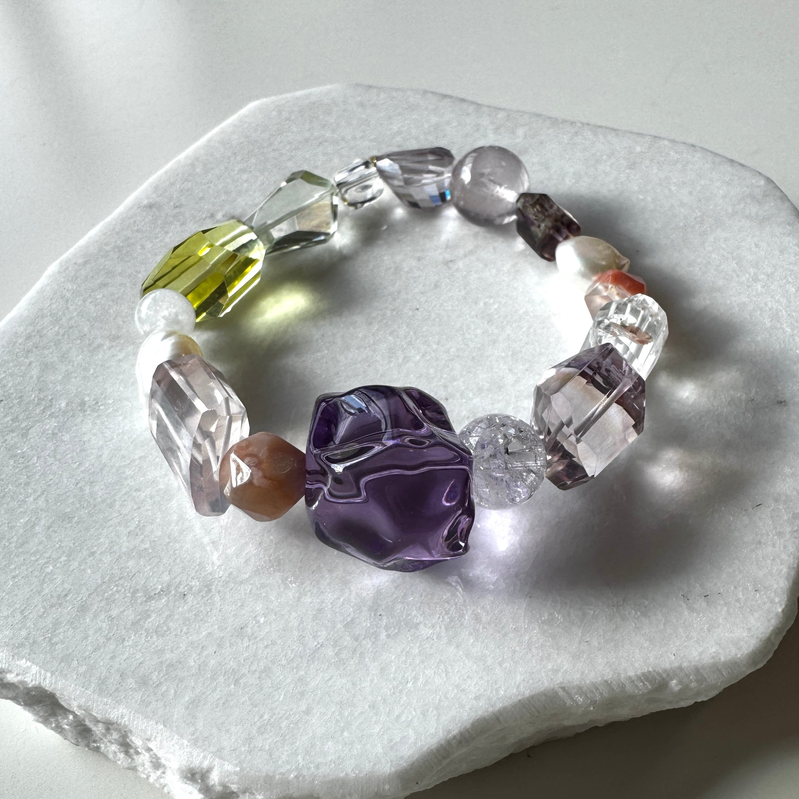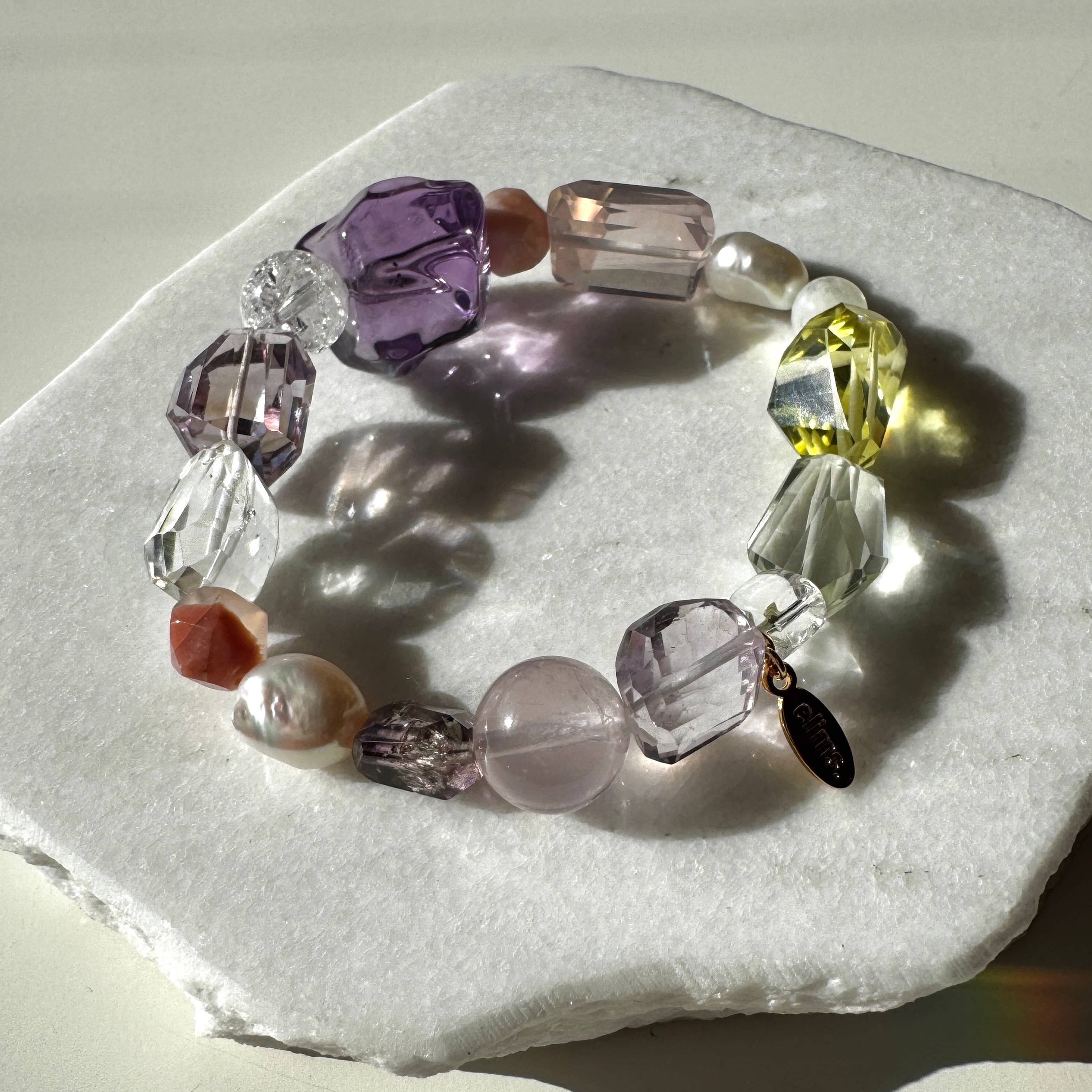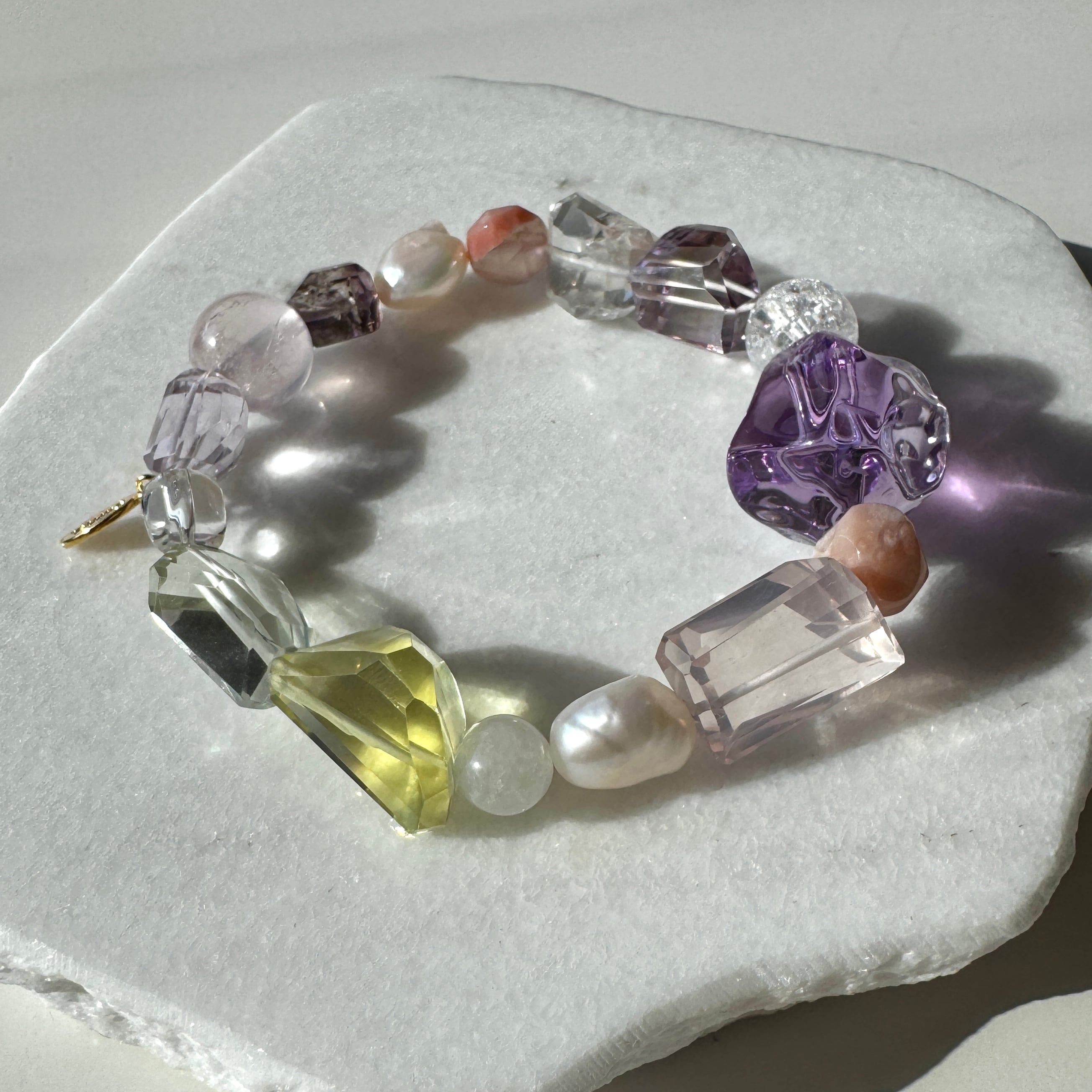 仕上げてくださった特別なアメジストを中心に、ピンク・グリーン・レモンの柔らかな光を重ねたオーロラの輝きのような一点物ブレスレット。