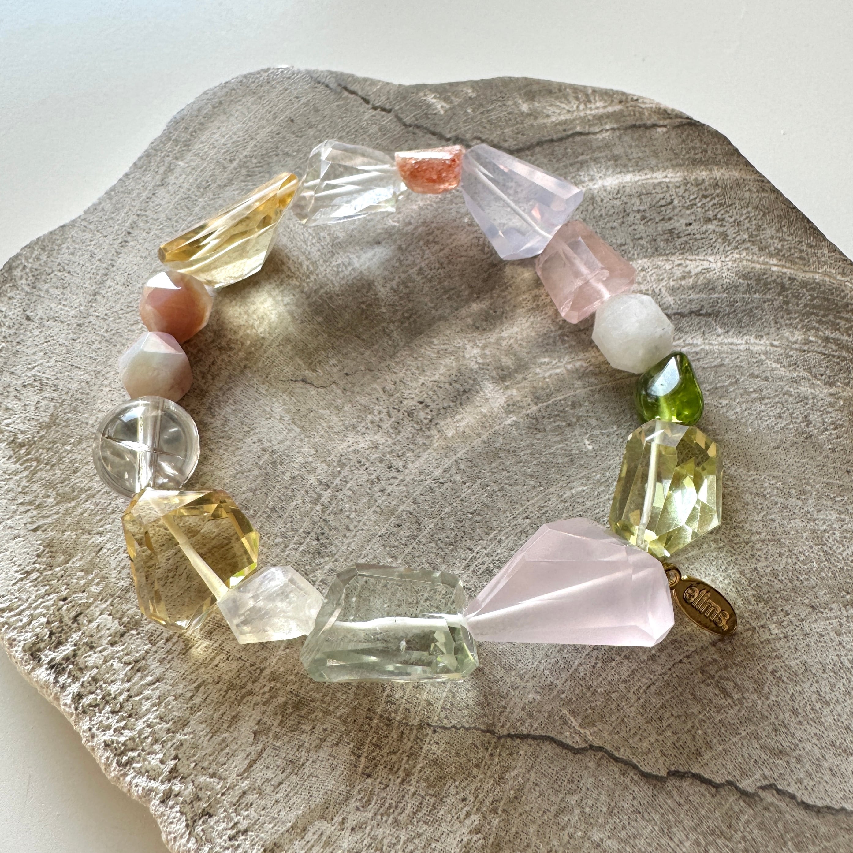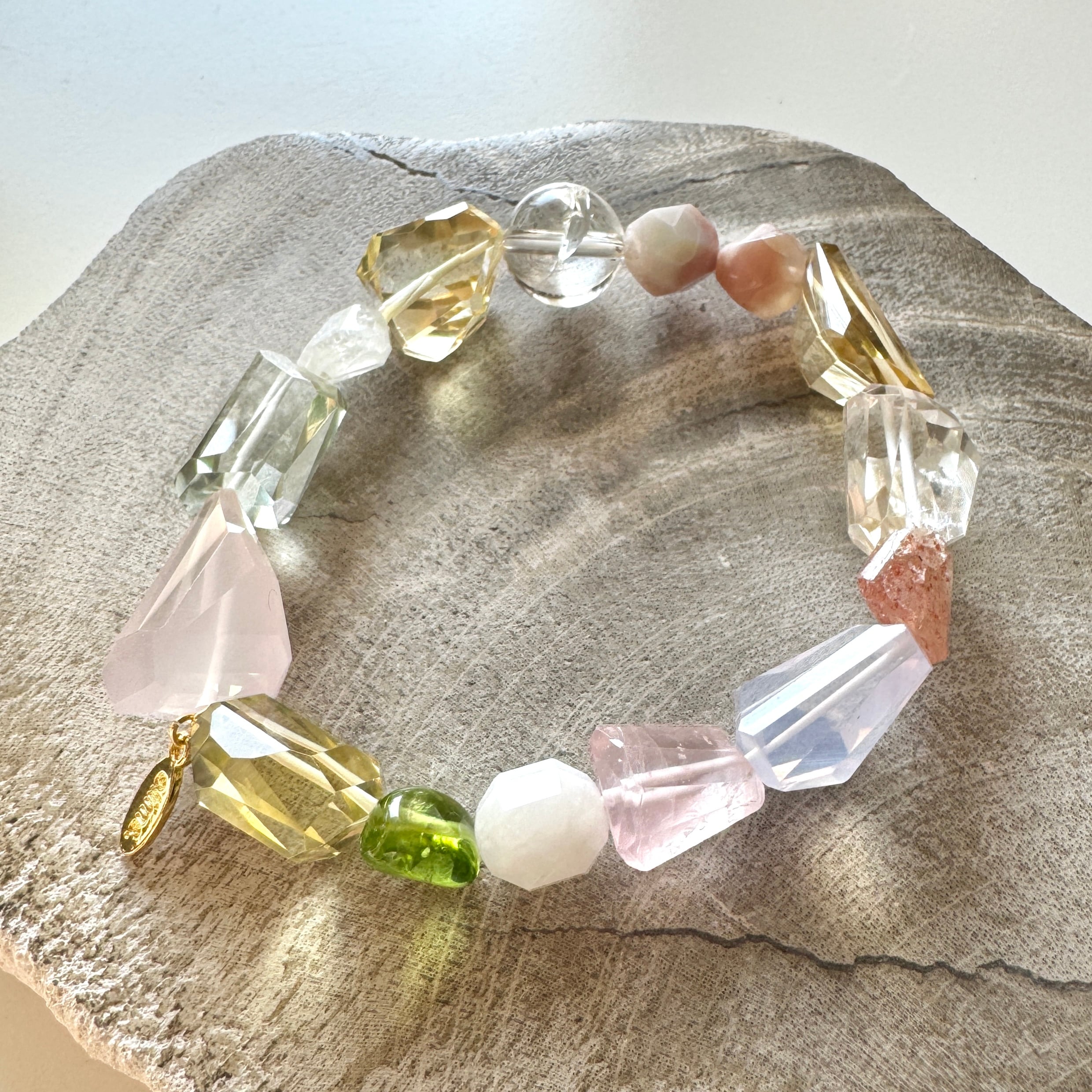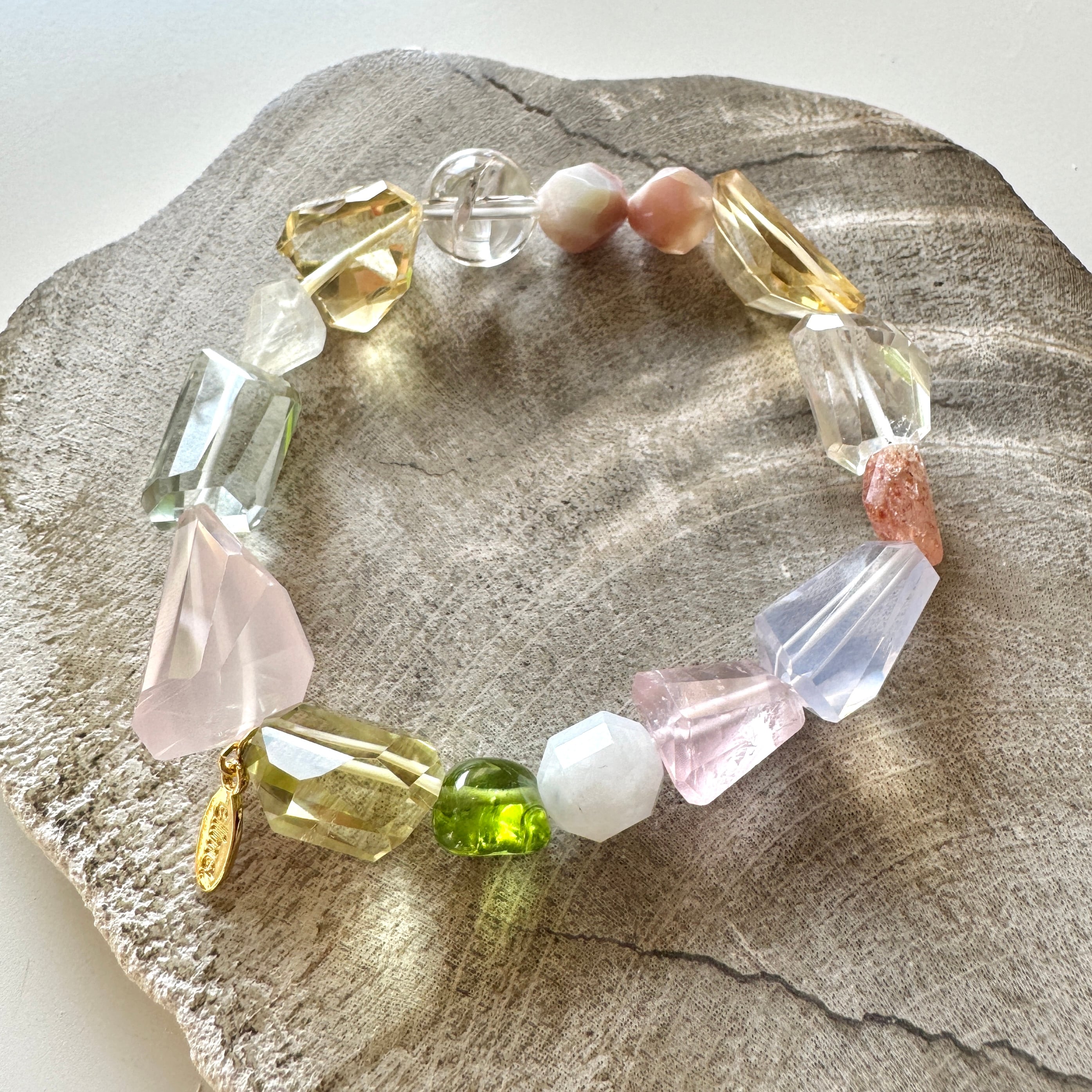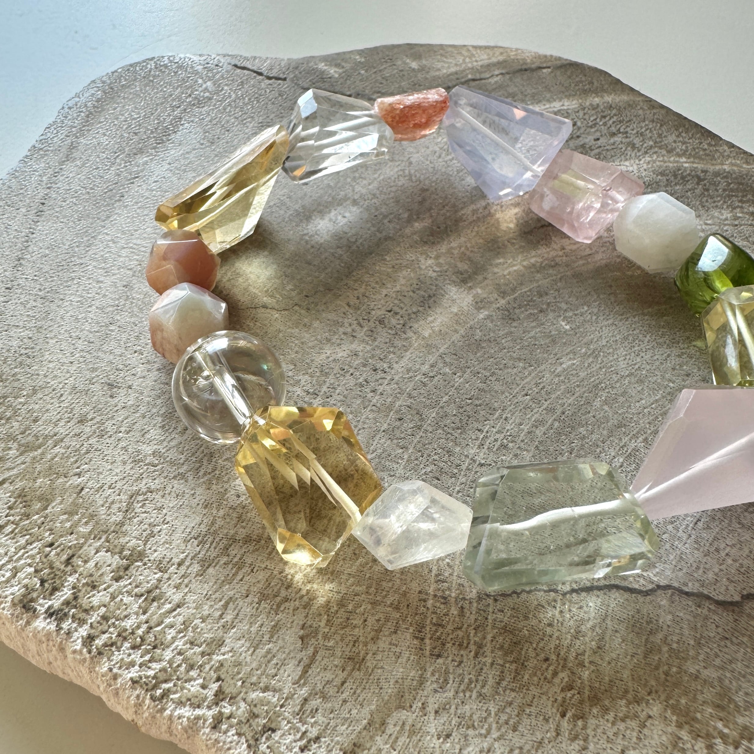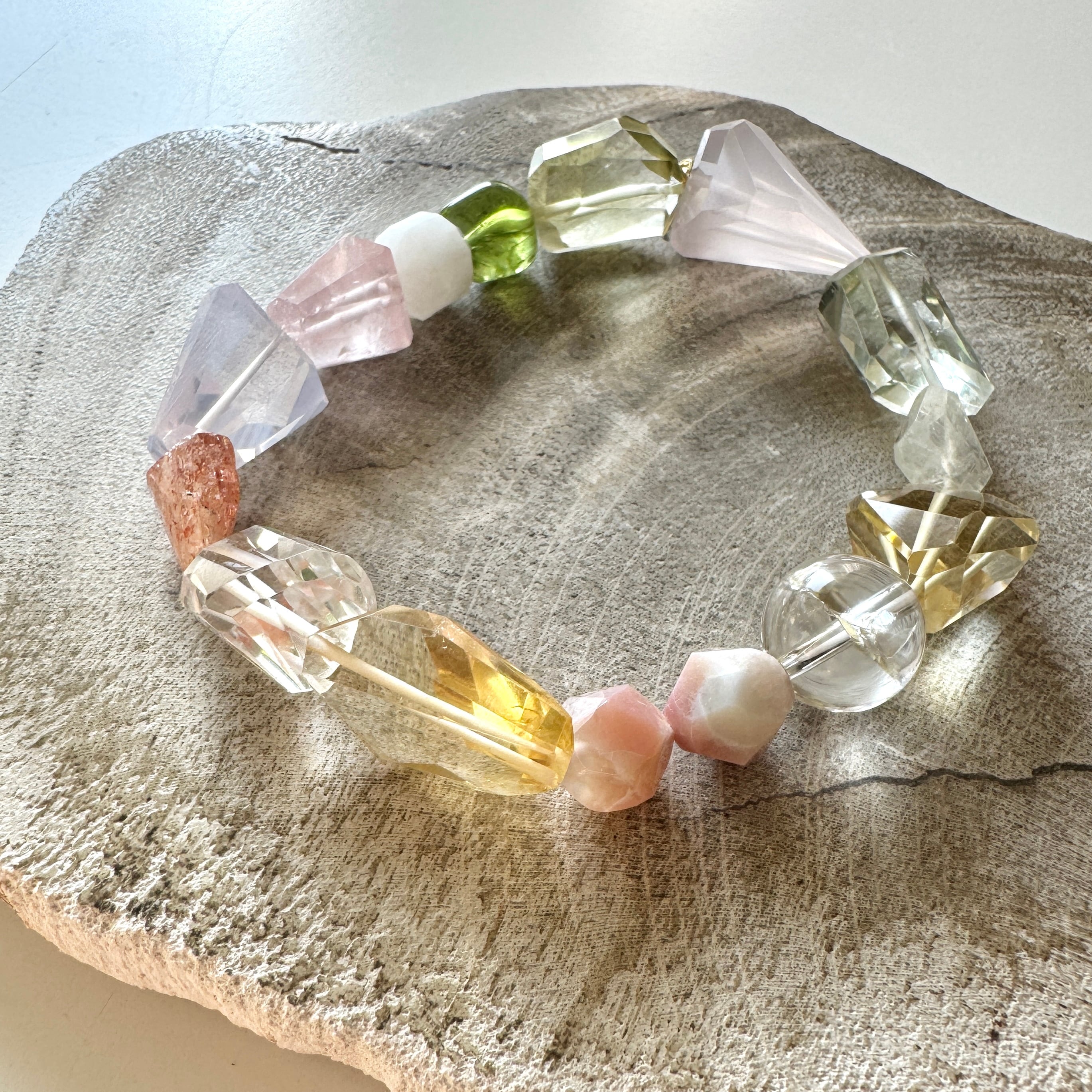 やさしい色の石たちを集めたブレスレット。