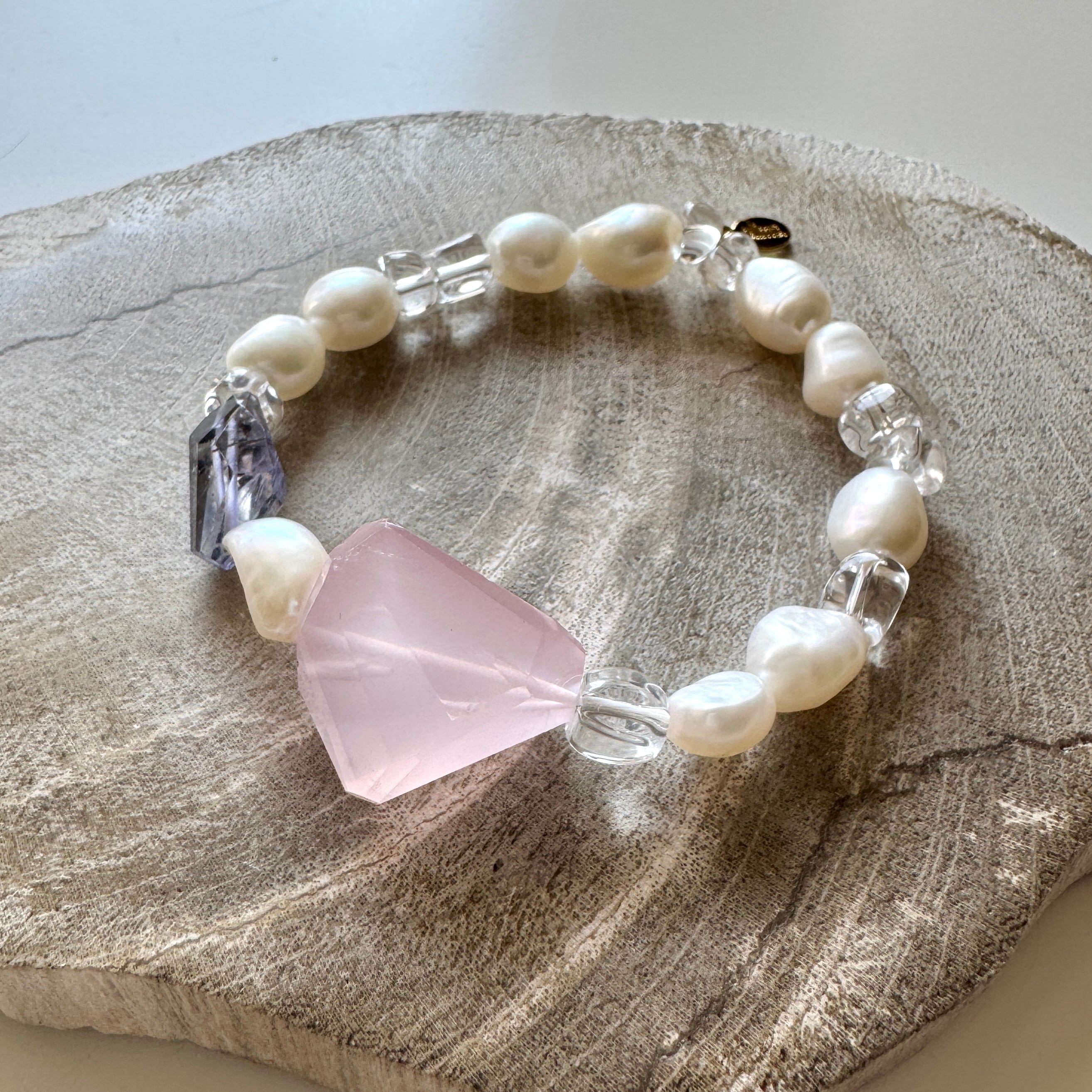 淡水パールにローズクォーツのやさしい光を重ねた一本。